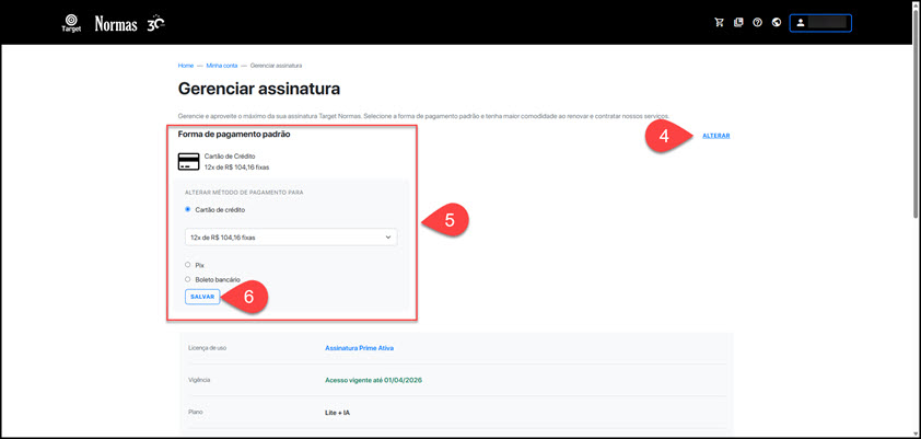 - Clique em "ALTERAR"; selecione a opção de pagamento desejada e clique em "Salvar".
