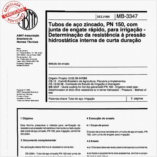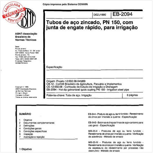 Prescreve condições exigíveis para a aceitação e recebimento de tubos de aço zincado, e respectivas juntas elásticas de engate rápido, empregados na condução e distribuição de água à temperatura não superior a 40 graus Celsius, nos sistemas de irrigaçã...