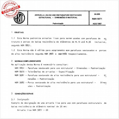 Esta Norma padroniza arruelas lisas para serem usadas como parafusos e porcas de alta resistência, de siâmetros de M.12 até M.36 inclusive, segundo as NBR9981 e NBR9982 respectivamente. This Standard establishes a pattern for straight washers to be use...