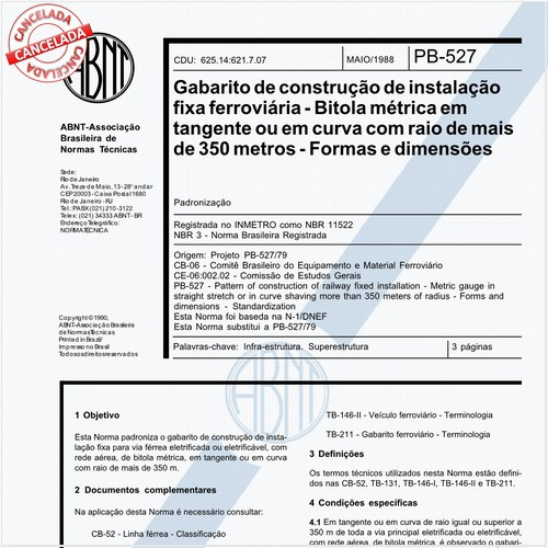Esta Norma padroniza as dimensões mínimas para o gabarito de construção de instalação fixa para via férrea eletrificada ou eletrificável, com rede aérea, de bitola normal e larga, em tangente ou em curva com raio de mais de 500 m.