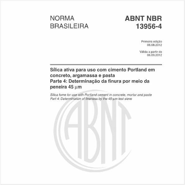 Esta Parte da NBR13956 especifica o método de ensaio para determinação da finura da sílica ativa por meio da peneira com abertura de malha de 45 µm. This Part of NBR13956 specifies the test method for the determination of the fineness of silica fume by the 45 µm test sieve. ISBN: 978-85-07-03598-5