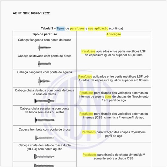 Sobre "Light Steel Framing - Sistemas construtivos estruturados em perfis leves de aço formados a frio, com fechamentos em chapas delgadas - Parte 1: Desempenho", Quais são os tipos de parafusos e sua aplicação no sistema construtivo?