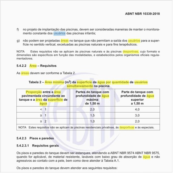 Sobre "Piscina — Projeto, execução e manutenção", Qual a área mínima (m²) da superfície da água por quantidade de usuários simultaneamente na piscina?