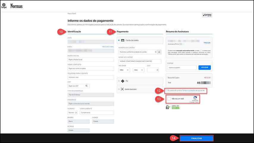 - Verifique as informações preenchidas com atenção e clique em "FINALIZAR" para concluir a sua Assinatura Prime.