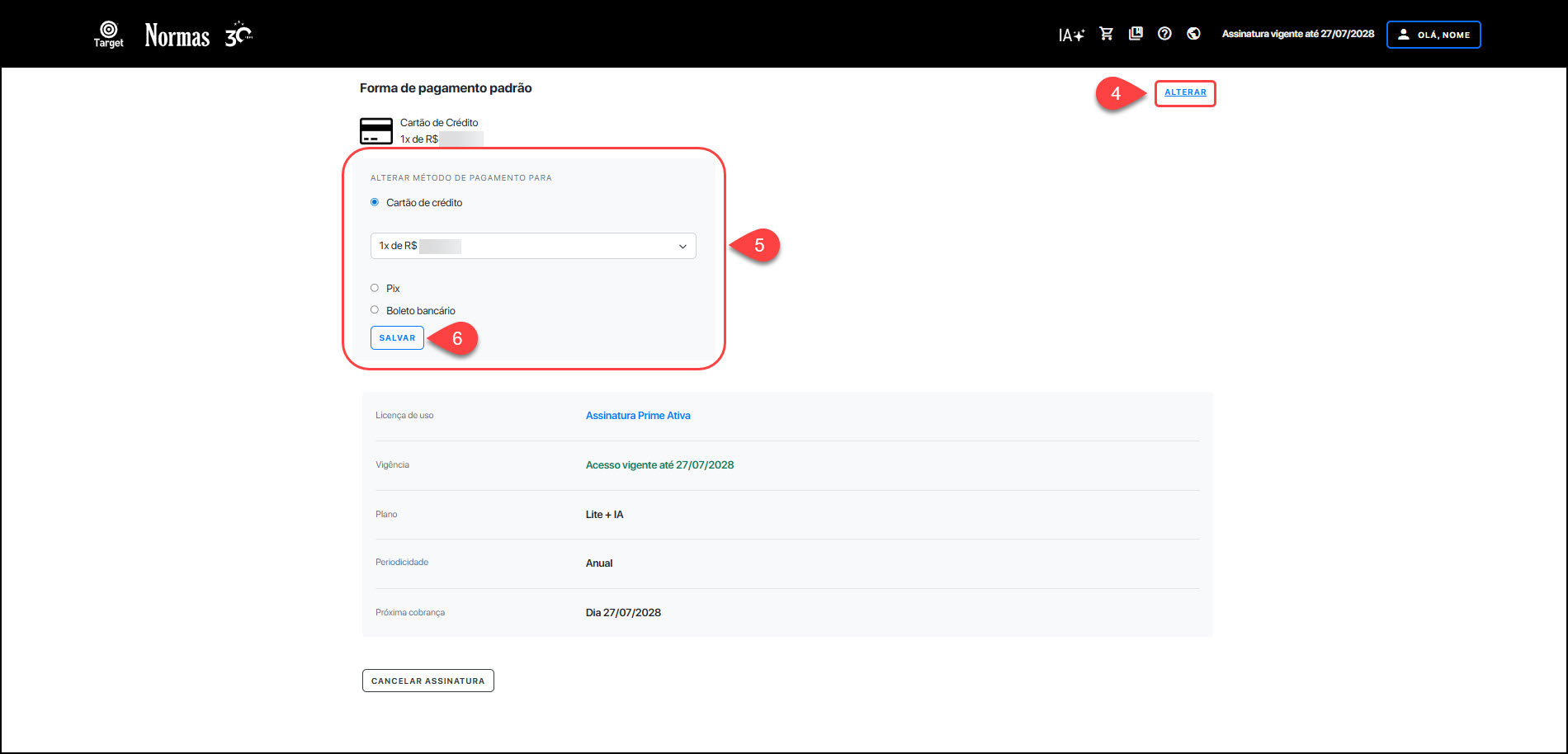 - Clique em "ALTERAR"; selecione a opção de pagamento desejada e clique em "Salvar".