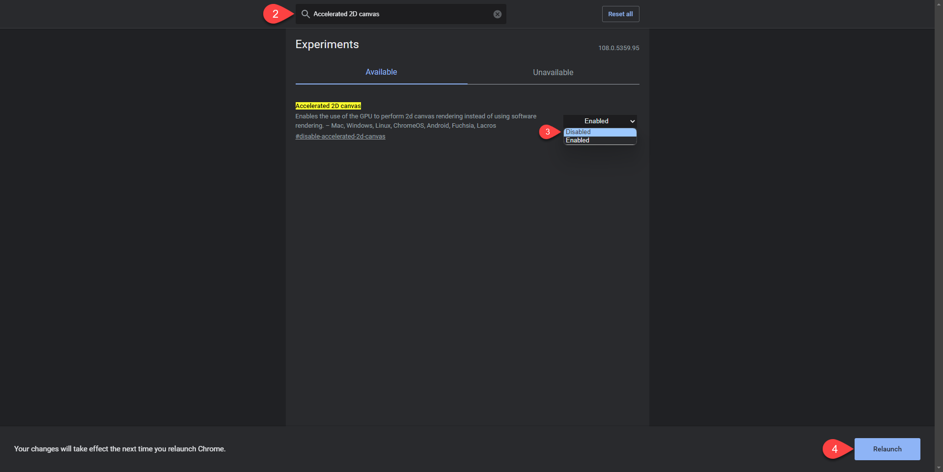 - Na barra de pesquisa, digite Accelerated 2D canvas;