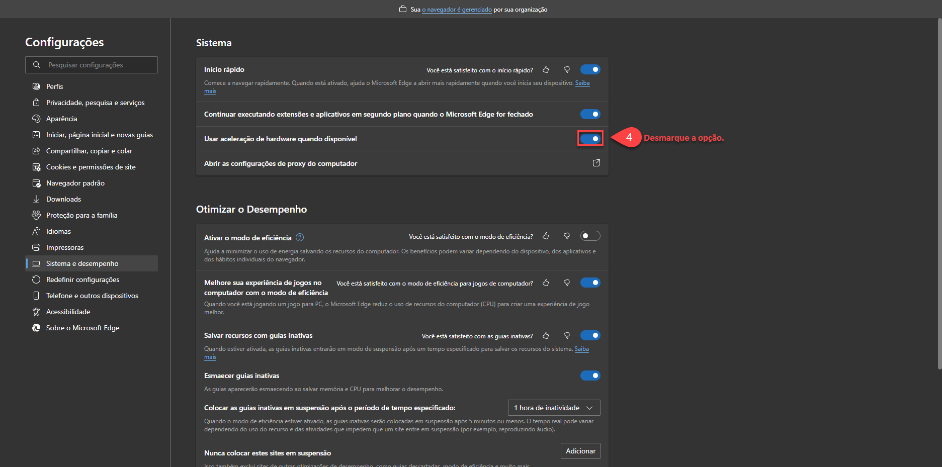 - Em seguida, procure pela opção "Usar aceleração de hardware quando disponível" e desmarque a respectiva opção;