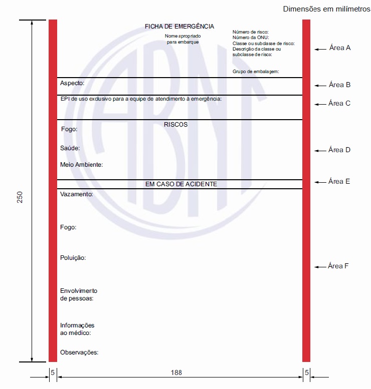 Os campos discriminados na figura abaixo devem conter no mínimo as informações estabelecidas, conforme instruções fornecidas pelo fabricante ou importador do produto perigoso transportado, presentes na Ficha de Informação de Segurança de Produtos Químicos (FISPQ), conforme a NBR 14725-4, ou outras fontes de informações sobre segurança ou emergências para o transporte de produtos perigosos. A ficha de emergência deve ser impressa (em gráfica ou em impressora), sendo permitidas cópias, desde que mantido o padrão definido nesta norma. O idioma a ser usado deve ser o oficial do Brasil.