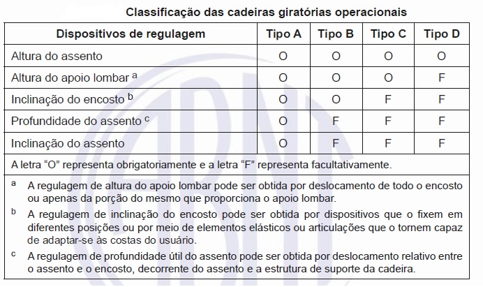As cadeiras giratórias operacionais são classificadas segundo os tipos A, B, C ou D conforme apresentem obrigatoriamente (O) ou facultativamente (F) para os dispositivos de regulagem descritos na tabela abaixo. As dimensões da cadeira giratória operacional devem estar de acordo com a tabela de dimensões abaixo.