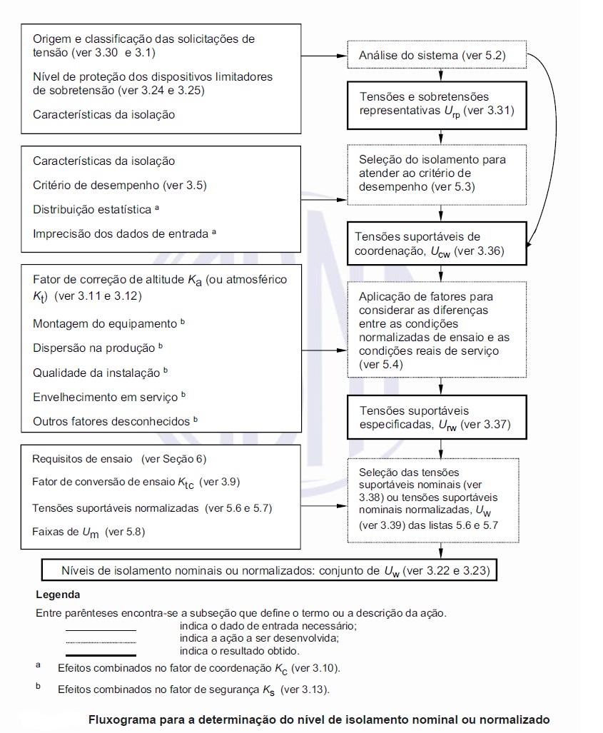 O procedimento para coordenação do isolamento consiste na seleção da tensão máxima do equipamento e no correspondente conjunto de tensões suportáveis nominais normalizadas que caracterizam a isolação do equipamento necessário para aplicação. Este procedimento é delineado na figura abaixo e suas etapas são descritas em 5.1 a 5.5. A otimização do conjunto selecionado de Uw pode requerer reconsideração de alguns dados de entrada e a repetição de parte do procedimento.