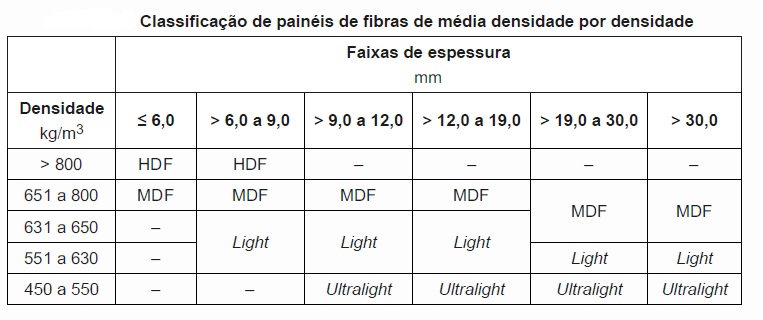 Os painéis de fibras de média densidade são classificados por densidade, conforme a tabela abaixo.