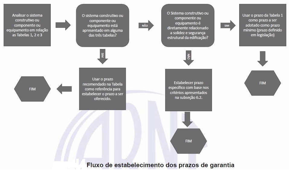 A NBR 17170 de 12/2022 - Edificações - Garantias - Prazos recomendados e diretrizes estabelece diretrizes para o incorporador, construtor ou prestador de serviços de construção em edificações de toda natureza de uso, no todo ou em suas partes, estabelecerem as condições e prazos de garantias, tecnicamente recomendados, e servir aos demais agentes envolvidos para conhecimento de suas incumbências perante as garantias. Aplica-se às condições de garantias que não são abrangidas pela legislação vigente, uma vez que as garantias legais se relacionam especificamente à adequação, segurança e solidez das edificações, entretanto não detalham aspectos específicos de suas partes por meio de seus sistemas, componentes e equipamentos. A figura abaixo ilustra o fluxo de estabelecimento dos prazos de garantia.