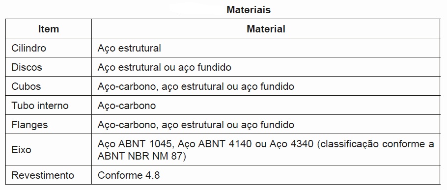 Na tabela abaixo estão indicados os materiais normalmente aplicáveis aos tambores. Os casos específicos devem ser acordados entre usuário e fabricante.